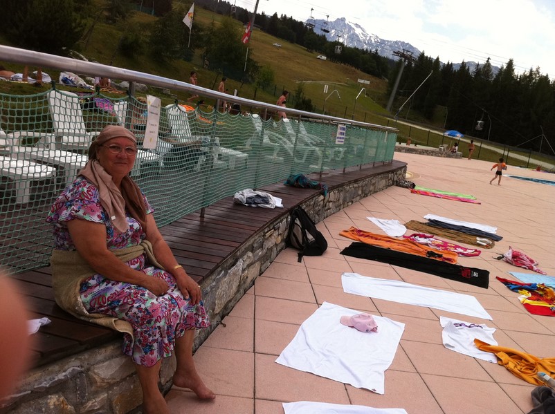 Mani surveille les serviettes et les sandwichs à la piscine